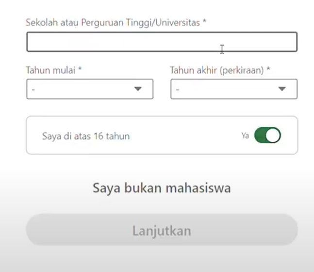 5. Setelah itu, Anda diminta untuk mengisi posisi pekerjaan terbaru Anda. Jika masih berstatus pelajar atau mahasiswa, klik ‘Saya mahasiswa’, lalu klik ‘Lanjutkan’.