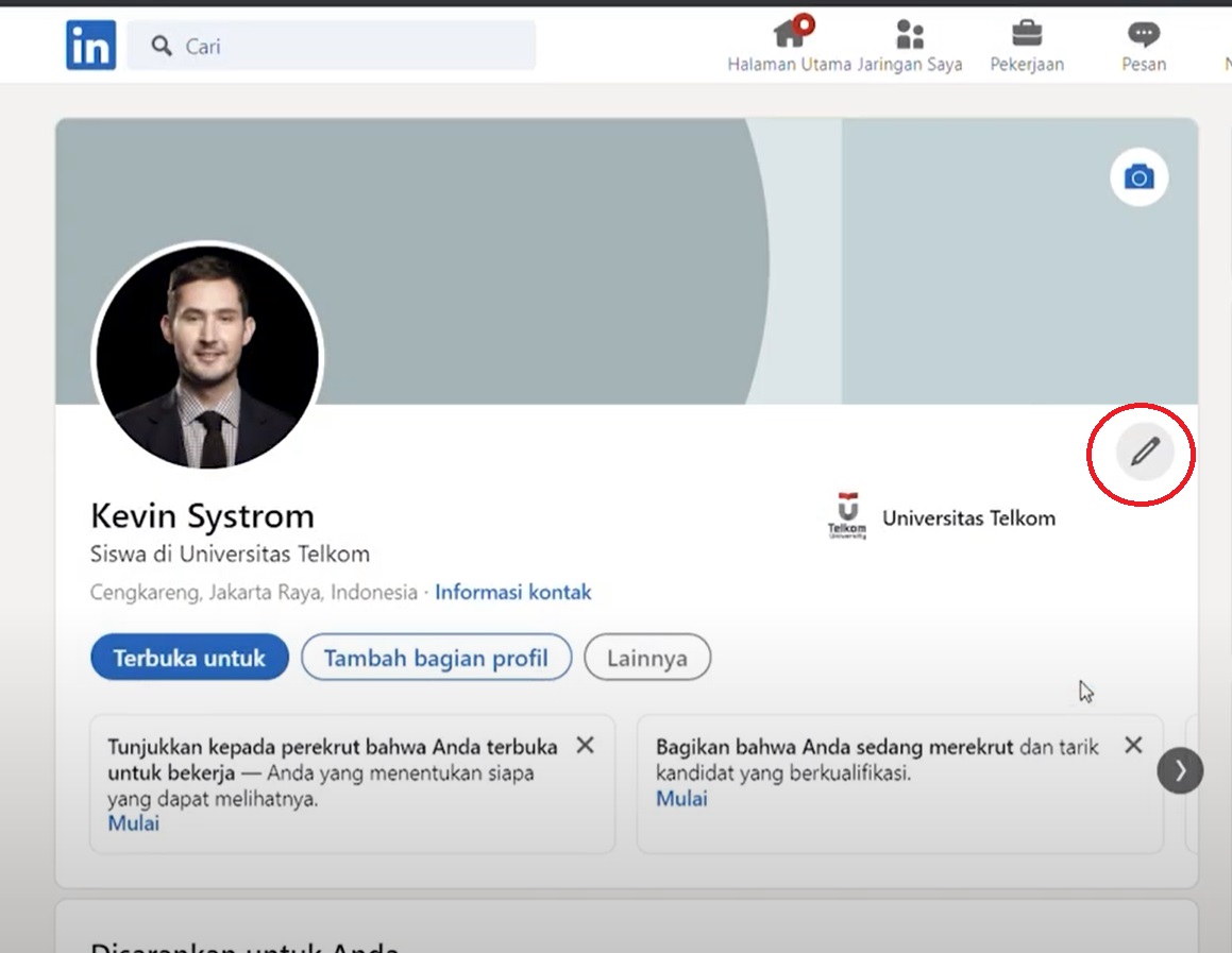 8. Jika foto sudah terupload, Anda bisa melengkapi profil Anda dengan mengklik logo yang kami lingkari berikut ini. Anda bisa mengubah riwayat pendidikan, pengalaman kerja dan organisasi, serta keterampilan yang Anda kuasai. Sekarang profil Linkedin Anda sudah siap digunakan.