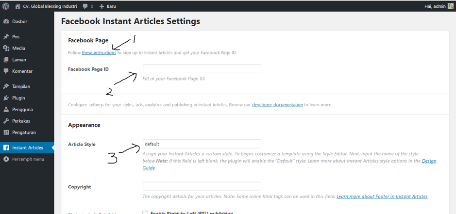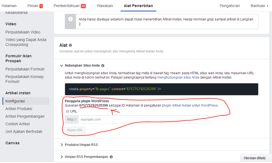 Copy dulu ID Halaman kamu kemudian kamu kembali ke dasbor wordpress kamu di menu artikel instan, masukin ID halaman kamu di plugin wordpress kamu untuk mengklaim Fanspage kamu supaya konek sama website kamu.
