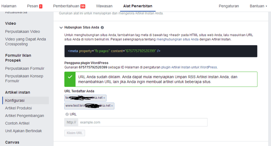 Jika website kamu berhasil di klaim, artinya sudah konek antara Artikel Instan di Fanspage kamu dengan website kamu maka akan muncul seperti gambar di atas.