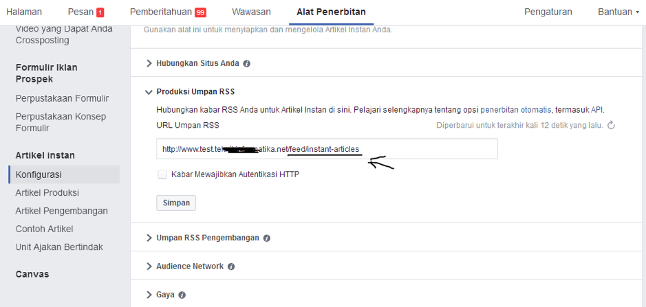 Sekarang bagaimana kita menyiapkan umpan RSS Artikel Instan, hal ini penting karena kita kan hanya posting artikel di website, nanti melalui umpan RSS ini yang sudah di setting, artikel dalam website kita akan secara otomatis tampil atau muncul di artikel instan Fanspage kamu. Jadi otomatis gitu, kamu cukup update postingan artikel di web, lalu kamu share aja link website itunya di akun facebook manapun, akan secara otomatis, jika link website kamu di buka di aplikasi facebook android/iOS akan tampil versi artikel instannya.
