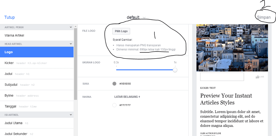 Masih di dasbor Fanspage Artikel Instan kamu, scroll kebawah, ada ‘GAYA’, klik oleh kamu, klik yang ‘DEFAULT’