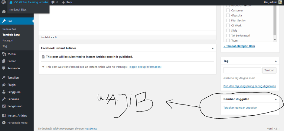 - Kenapa gambar penting? Karena kan ketika artikel instan kita muncul, itu selalu muncul gambar, judul kemudian isi artikelnya, jadi penting gambar itu. Padi setiap postingan artikel kamu harus disertai gambar unggulan ya, WAJIB.
