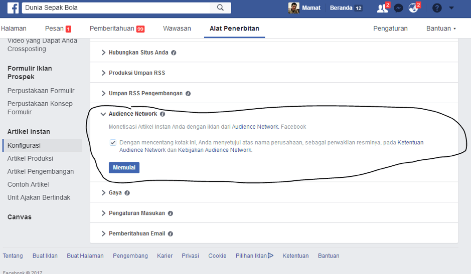 Jadi rekan-rekan, selain bayar iklan ke Facebook, saat ini rekan-rekan juga bisa dapet uang dari Facebook, caranya dengan menjadi mitra publisher bagi iklan-iklan yang diterima oleh Facebook. Kalau kita bicara Google Adsense kan, orang bayar iklan ke Adsense, terus iklannya muncul di Web kita yang kita pasang script adsensenya, Facebook pun sekarang demikian. Kalau Google, iklannya bisa muncul di video youtube, website, aplikasi android. Facebook pun bisa muncul iklannya di website kita, aplikasi, dan juga Artikel Instan Facebook.
