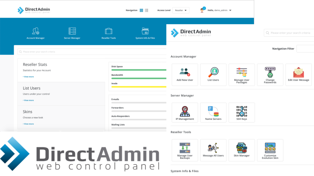 Untuk tampilan pengaturan semua opsi dikelompokkan dan diletakkan pada bagian atas. Control panel ini juga mendukung beberapa level akses: Administrator, User, dan Reseller. Bahkan, panel ini memiliki tool anti-spam bawaan. Keunikan dari Direct Admin adalah Anda dapat menggunakan panel ini untuk melihat statistik serta penggunaan secara lengkap dari setiap resource.