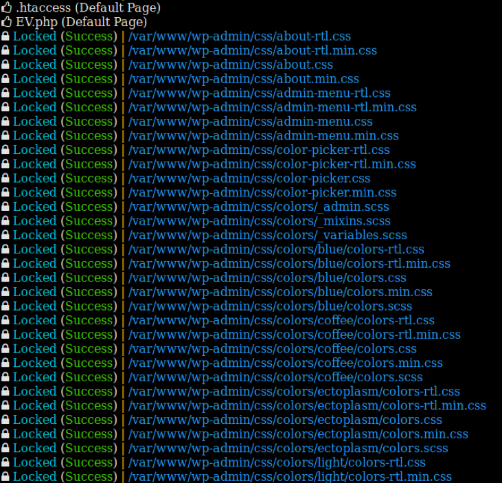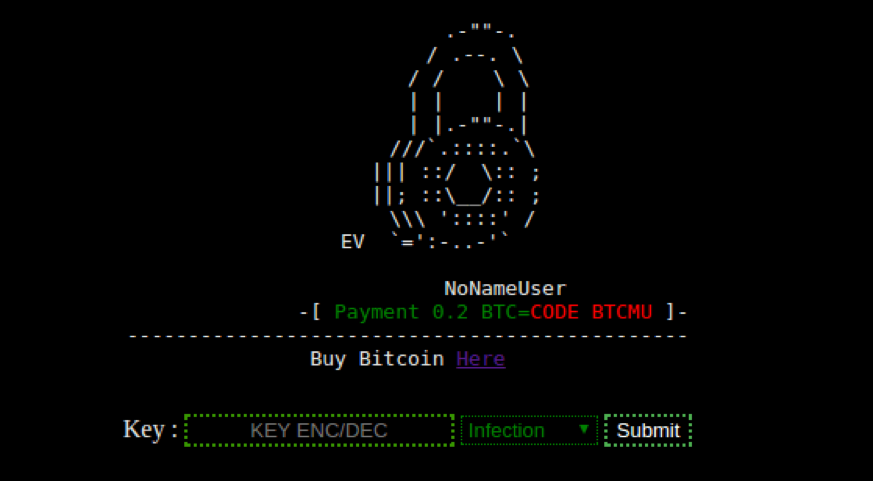 Ketika proses enkripsi di mulai, ransomware membuat dua file dalam folder instalasi. Pertama bernama EV.php, sebuah file yang berisi sebuah antar muka yang bisa digunakan oleh pengguna untuk membuka kunci jika mereka punya kodenya. File ini memiliki form, tapi tidak berjalan Karena tidak memiliki fungsi dekripsi. File ke dua adalah .htaccess, file yang mengalihkan request URL ke file EV.php. Pertama kali ketika website telah di enkripsi, itu akan menampilkan seperti ini :