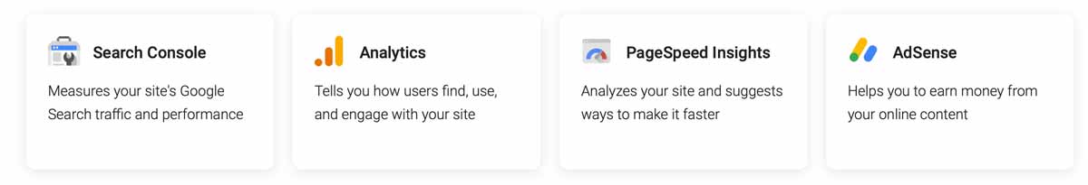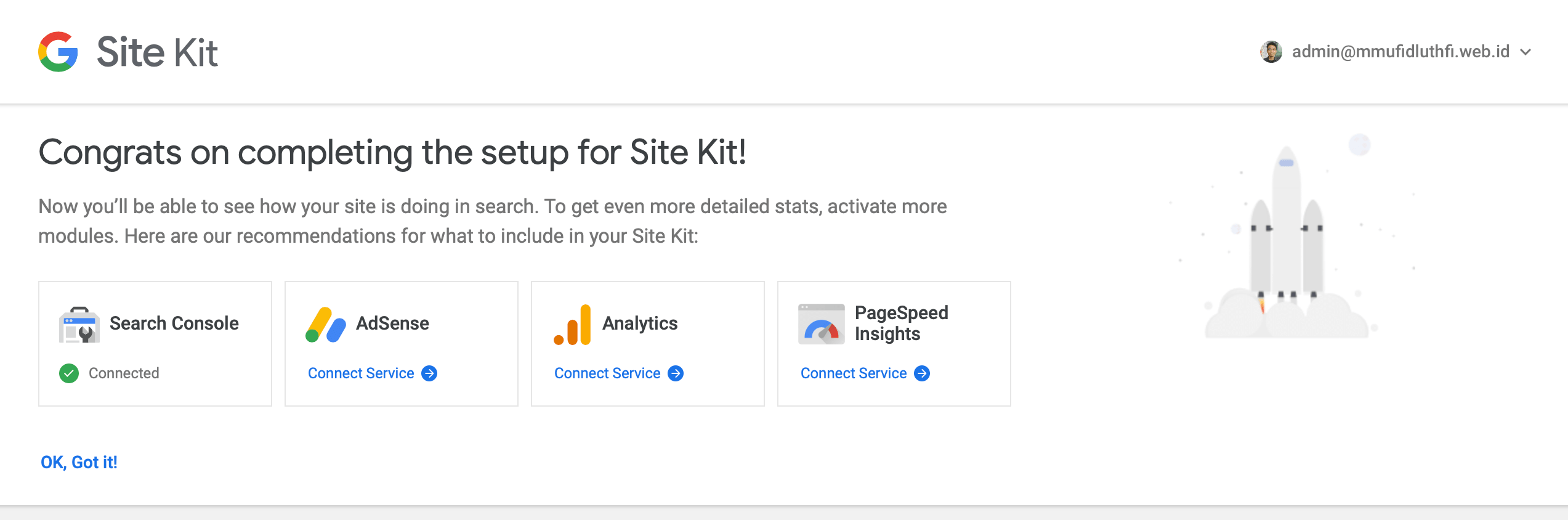 Google Site Kit Plugin yang terinstall di WordPress memungkinkan Anda untuk dapat terhubung ke beberapa layanan Google seperti :