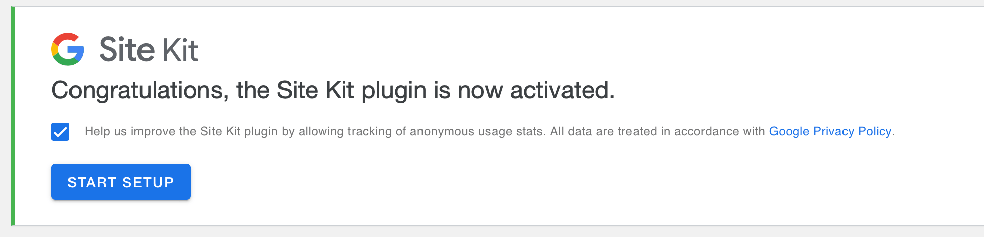 1. Pada Dashboard Google Site Kit Plugin, Klik Start Setup untuk memulai