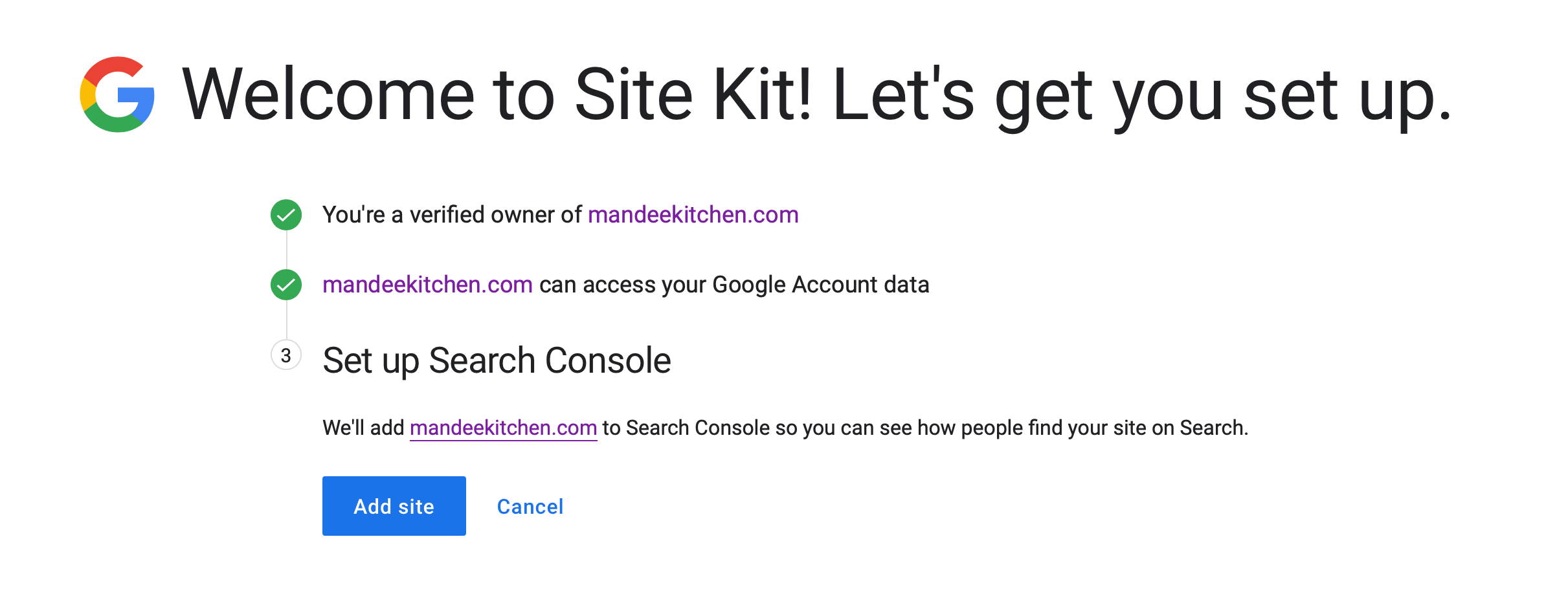 5. Selanjutnya Anda hanya tinggal menambahkan wesbite tersebut untuk dapat terhubung ke Google Site Kit Plugin