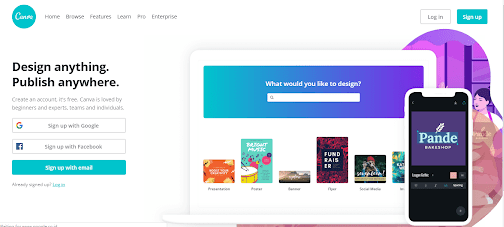 Pertama, Anda perlu memiliki account Canva. Anda bisa sign up atau login di https://www.canva.com. Ada beberapa pilihan untuk Facebook, Gmail maupun registrasi dengan mengisi data pribadi anda untuk membuat akun canva.