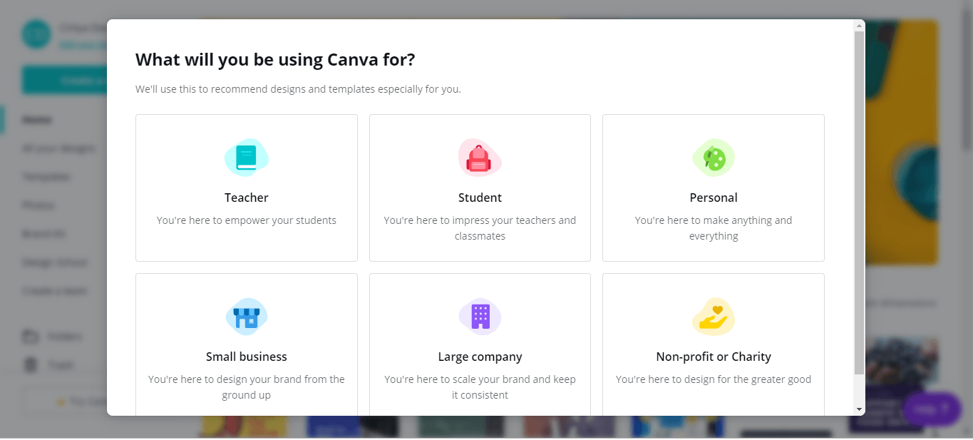 Setelah itu, Anda akan diberi pilihan untuk memilih apa yang akan Anda lakukan dengan account Canva Anda. Pilih sesuai kebutuhan Anda. Misalnya, anda membutuhkan canva untuk desain bisnis online produk anda. Anda bisa menggunakan small business atau personal.
