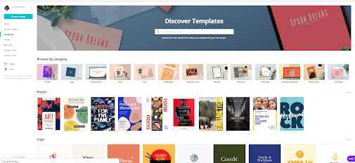 Selanjutnya, anda dapat Memilih layout graphic Anda. Seperti yang sudah disebutkan sebelumnya, Anda bisa membuat berbagai jenis graphic di Canva. Mereka menyediakan berbagai macam layout dengan dimensi yang sudah disesuaikan untuk platformnya. Beberapa contoh kategori yang mereka sediakan adalah social media posts, documents, blogging, ebooks, infographics, marketing materials, events, dan ads.