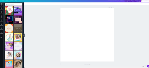 Disini terdapat lembar kerja anda yaitu segiempat berwarna putih yang merupakan area desain anda nantinya. Dengan berbagai template ini, Anda tidak perlu memulai dari nol. Anda juga bisa mengupload gambar Anda sendiri.