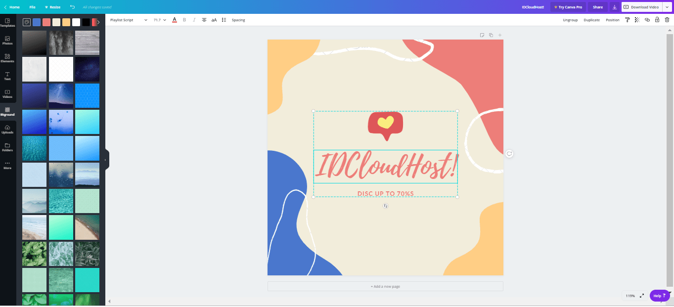 Canva menawarkan berbagai template text yang dapat Anda gunakan agar graphic Anda memiliki typography yang menarik.Colour Palette. Canva memperbolehkan Anda mengatur warna graphic Anda sesuai keinginan dan kebutuhan. Canva sendri menyarankan Anda mengatur colour palette untuk graphic tersebut. Seperti yang bisa Anda lihat, Canva sudah mengumpulkan warna-warna apa saja yang ada pada colour palette gambar ini.