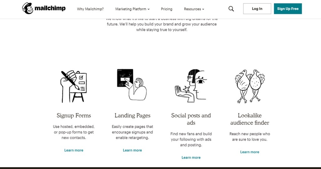 Ini adalah fitur utama yang paling menarik dan menjadi daya tarik utama berbagi setiap pengguna Mailchimp. Melalui fitur ini pengguna dapat membuat berbagai konten untuk keperluan marketing yang mencakup landing page, sign up forms, remarketing ads dan lainnya.
