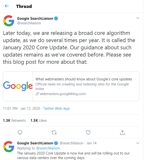 Pada tanggal 13 januari 2020, Google mengkonfirmasi telah melakukan pembaruan algoritma. Hal ini dicantumkan dalam cuitan akun twitter Google yang berjudul “2020 Januari pembaruan” di awal minggu januari ini.