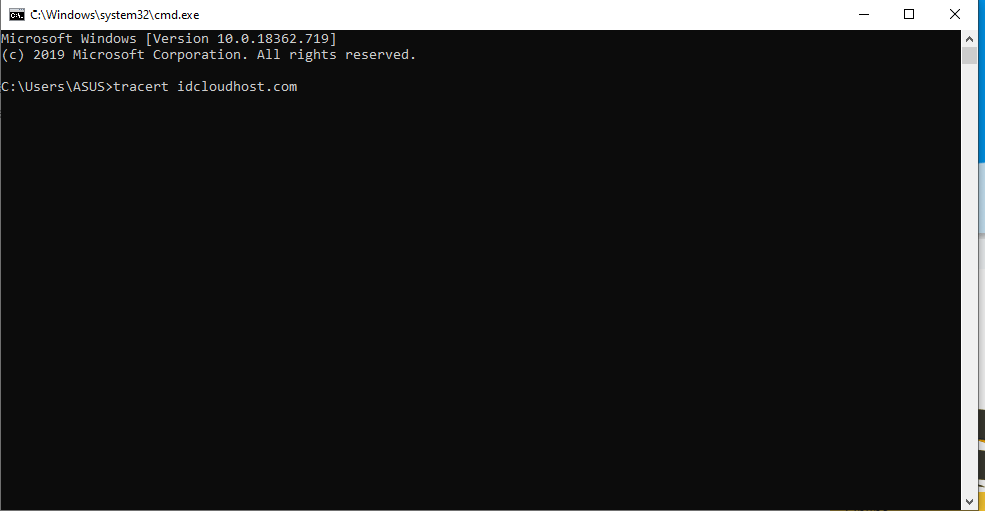 4. Jika website yang anda tuju tidak membalas  di ping dari anda. maka anda dapat melakukan pengecekan dengan tracert. Maka silahkan anda lakukan tracert domain, untuk melihat dimanakah domain tersebut tidak bisa resolve ke hostingnya. Dengan cara mengetik “Tracert  Idcloudhost.com (nama domain) “.