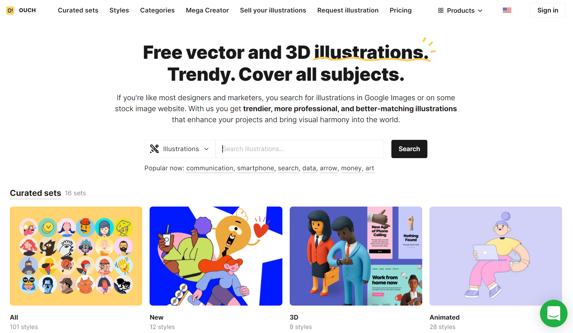 Ouch! adalah website ilustrasi gratis yang diciptakan oleh Icons8. Website ini menyediakan berbagai ilustrasi yang ciamik dan modern untuk kebutuhan desain media sosial, website, atau aplikasi Anda. Ada berbagai gaya ilustrasi karya para ilustrator handal yang dapat Anda pilih sesuai keinginan.