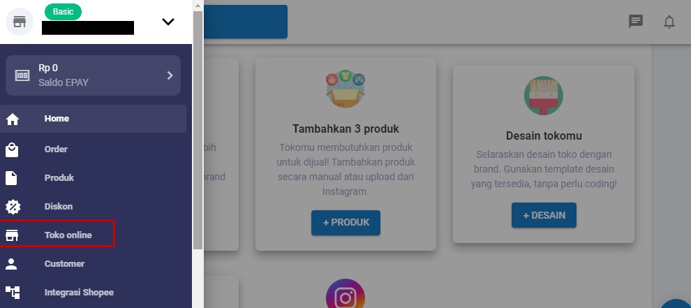 Selanjutnya, tampilan dashboard TokoTalk akan muncul ketika Anda telah berhasil login. Pada tahap ini, klik menu Toko Online pada Dashboard.