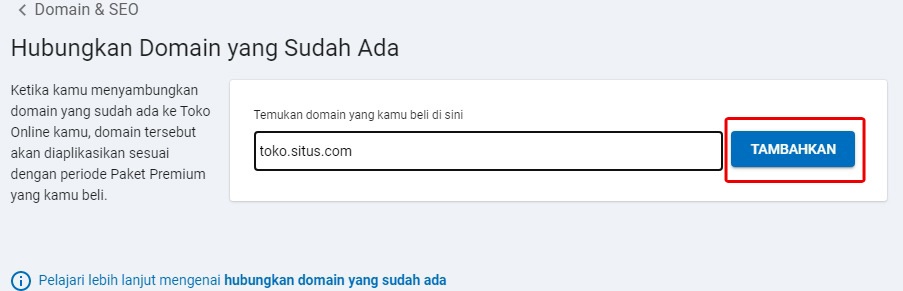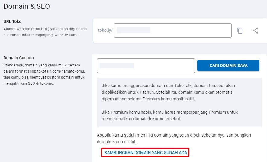 Pilih menu Domain Custom hingga muncul tampilan berikut ini. Lalu, klik pilihan SAMBUNGKAN DOMAIN YANG SUDAH ADA. Jika ingin melakukan custom domain, pastikan Anda sudah meng-upgrade akun TokoTalk ke layanan premium.