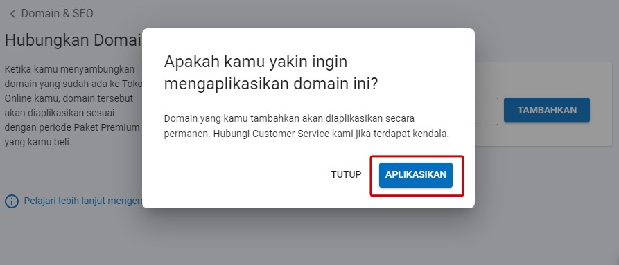 Notifikasi yang meminta konfirmasi akan tampil setelahnya. Jika ingin melanjutkan langkah custom domain, klik Aplikasikan. Setelahnya, subdomain atau domain sudah berhasil Anda tambahkan.