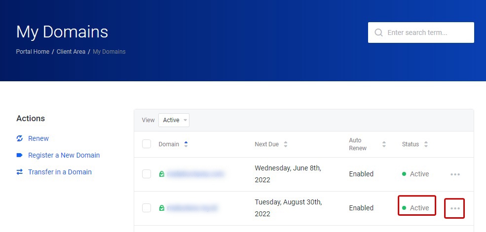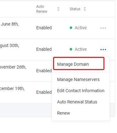 Setelah berhasil masuk ke Client Area IDCloudHost, tampilan dashboard seperti gambar berikut akan muncul. Jika ingin mengatur CNAME Record untuk domain utama, Anda bisa klik Domain, selanjutnya pilih domain yang masih berstatus ‘active’. Klik ikon tiga titik di samping status domain, lalu pada menu drop down yang muncul, klik Manage Domain.