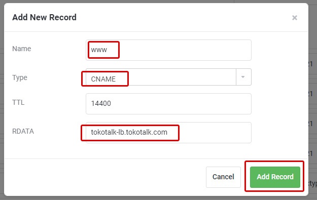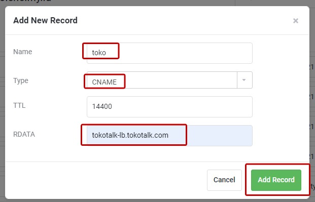 Setelah memilih menu Add Record, Anda dapat mengatur CNAME Record seperti pada gambar berikut. Name harus sama dengan subdomain yang Anda tulis saat custom domain dari sisi TokoTalk.