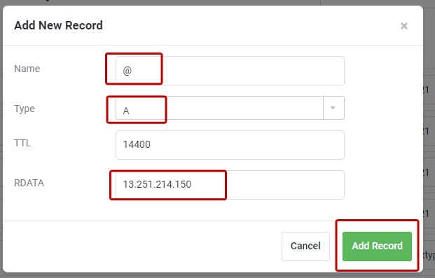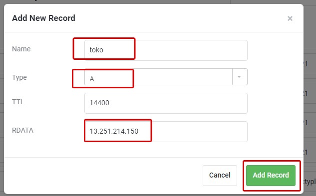 Terakhir, masukkan IP Address TokoTalk 13.251.214.150 pada kolom RDATA dan klik Add Record.
