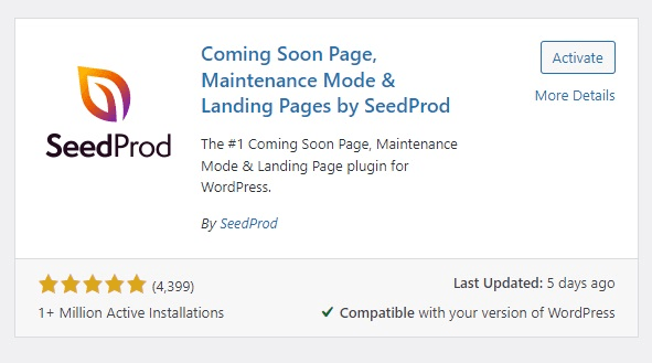 Pertama-tama, Anda dapat menginstall plugin SeedProd terlebih dahulu melalui menu Plugin > Add New pada dashboard WordPress Anda. SeedProd adalah plugin page builder yang memungkinkan Anda untuk mendesain halaman sendiri dengan cepat dan mudah. Jika sudah menemukan pluginnya, klik Install Now. Kemudian, klik Activate jika proses instalasi sudah selesai.