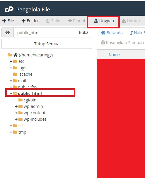 Masuk ke folder public_html dan carilah folder tema yang biasanya terletak di wp-content/themes. Setelah itu, upload file LandingPage yang kita buat sebelumnya ke dalam folder tema tersebut.
