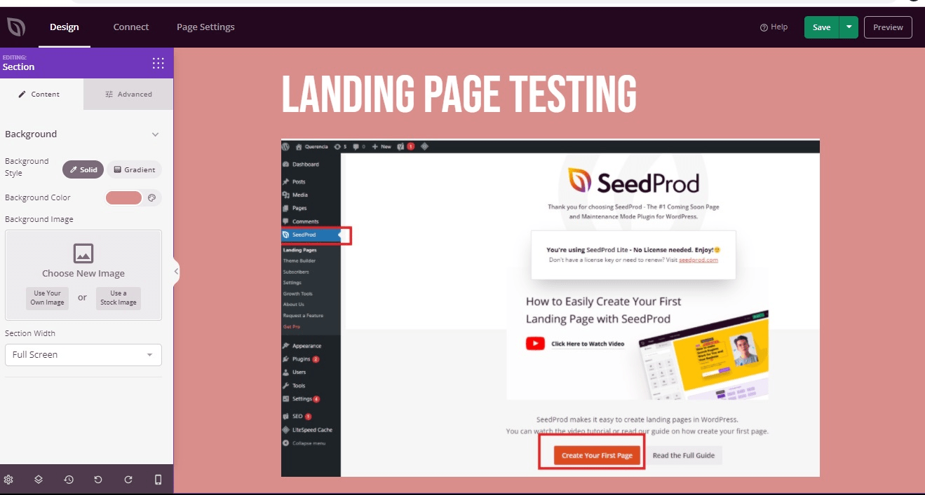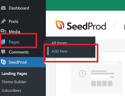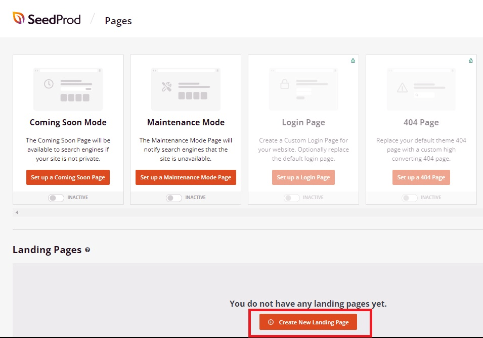 Jika sudah mengaktifkan plugin ini, akan muncul menu Seedprod pada dashboard Anda. Klik SeedProd > Landing Pages. Setelah itu, klik Create New Landing Page untuk mulai mendesain.