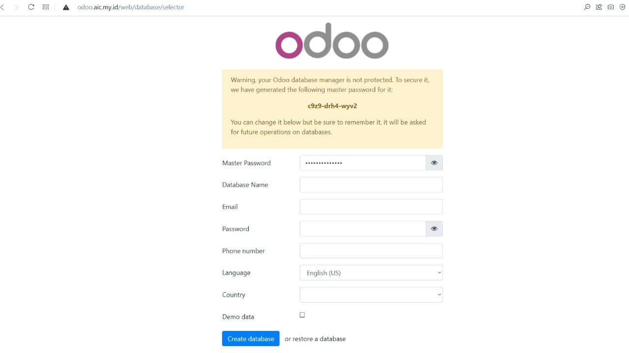 Bila anda ingin melakukan akses pada odoo dengan cara native dapat cara akses nya setelah vm berhasil di create buka alamat http://ip-address-vm:8069. Jika Anda memilih native, lanjut ke langkah ke 16 saja.
