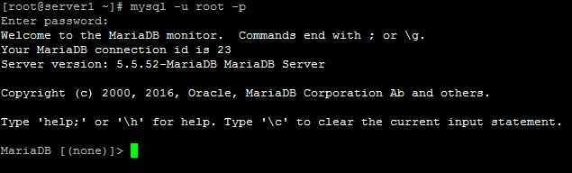 Anda akan diminta untuk password yang Anda tetapkan untuk root ketika Anda menginstal MySQL. Setelah password yang dikirimkan, Anda akan diberikan command prompt MySQL.
