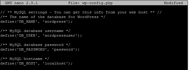 // ** MySQL settings – You can get this info from your web host ** // /** The name of the database for WordPress */ define(‘DB_NAME’, ‘ wordpress ‘); /** MySQL database username */ define(‘DB_USER’, ‘ wordpressuser ‘); /** MySQL database password */ define(‘DB_PASSWORD’, ‘ password ‘);