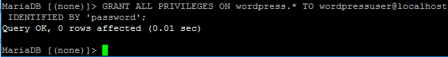 GRANT ALL PRIVILEGES ON wordpress .* TO wordpressuser @localhost IDENTIFIED BY ‘ password ‘;