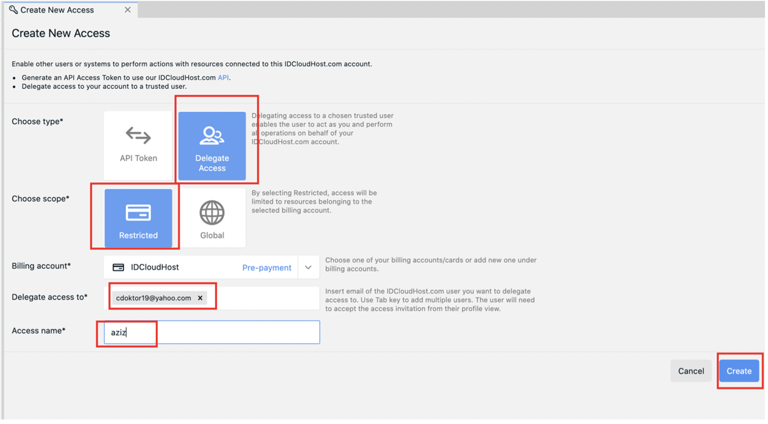 Pada type klik pilihan Delegate Access, dan pada scope pilih Restricted, billing account akan menggunakan default yang kita miliki jika hanya meiliki 1 billing, dan pada pilihan Give Access to ketikan email dari user yang akan diberikan hak akses terhadap biling dan resource terkait billing tersebut, pastikan email yang di masukan sudah terdaftar di console, dan pada Access name bisa diketikan dengan nama bebas sesuai kebutuhan, lalu klik Create.