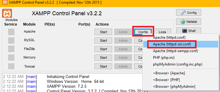 - Buka XAMPP, lalu klik Config > Apache ( httpd-ssl.conf ).