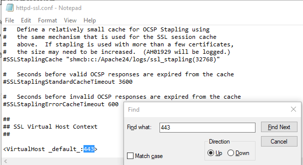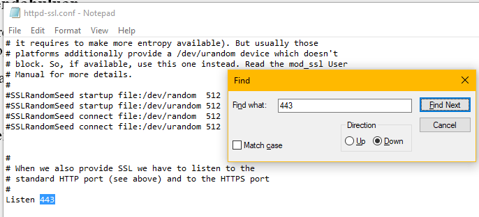 - Masukan angka “443â€, lalu Find Next. Jika menemukan ubah menjadi port yang dinginkan. Ubah semua angka “443†yang ada, sebagai contoh di panduan ini mengubah angkanya menjadi “440â€. Jika sudah Save.