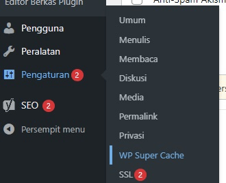 Pertama-tama, Anda harus sudah login ke dashboard WordPress Anda dan mengaktifkan plugin WP Super Cache. Jika plugin sudah aktif, maka Anda bisa mengaksesnya lewat menu Pengaturan (Settings) > WP Super Cache.