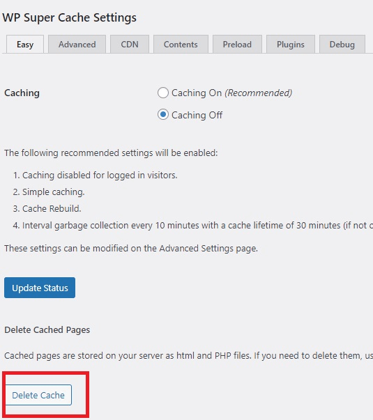 Setelah itu, tampilan konfigurasi plugin ini akan muncul. Pilih tab Easy, kemudian klik Delete Cache pada bagian Delete Cached Pages.
