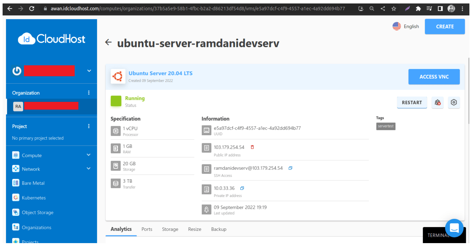 10. Pada halaman detail VM, Anda bisa cek username dan IP Public yang akan Anda gunakan untuk menghubungkan pada Control Panel VPS Paas.id.