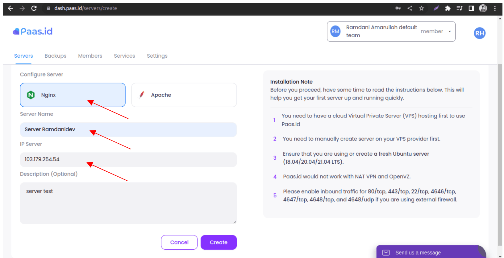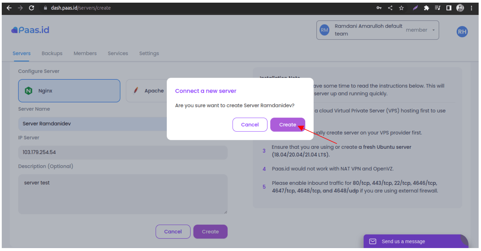 13. Selanjutnya pada bagian Configure Server silakan pilih software server dan ssuaikan kebutuhan Ada. Dalam tutorial ini, kami memilih Nginx sebagai HTTP server proxy. Lalu isi server name yang Anda butuhkan, setelah itu isi IP Public server VM yang Anda buat pada Awan IDCloudHost dan isi deskripsi jika dibutuhkan setelah itu klik Create.