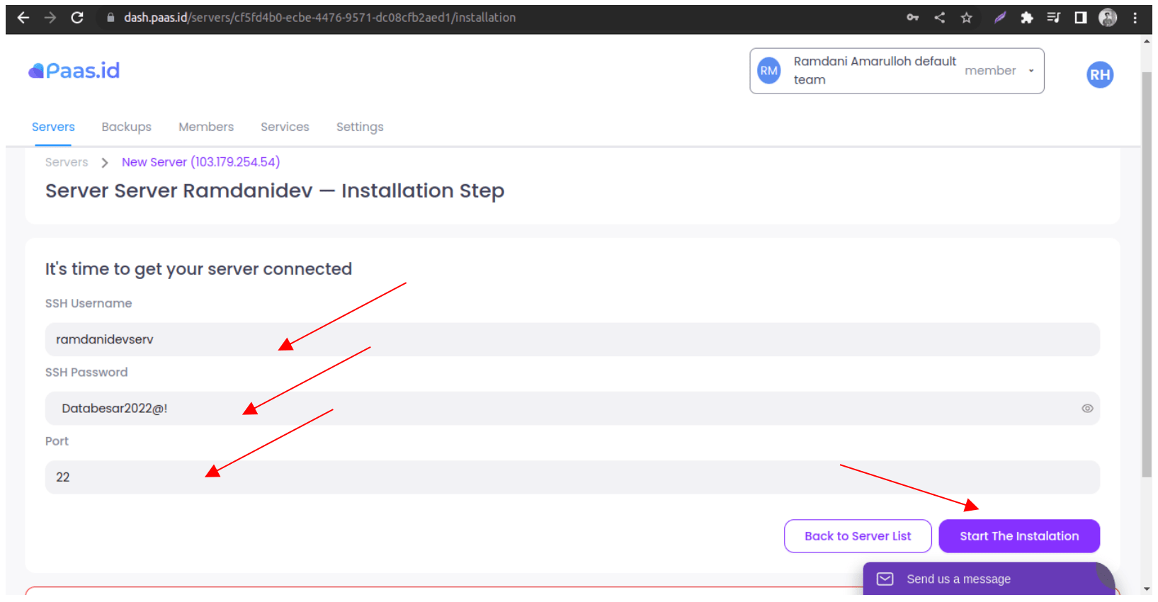 15. Pada halaman selanjutnya isi SSH Username dan SSH Password yang Anda buat pada VM Awan IDCloudHost sebelumnya, isi port 22 setelah itu klik Start the Installation.