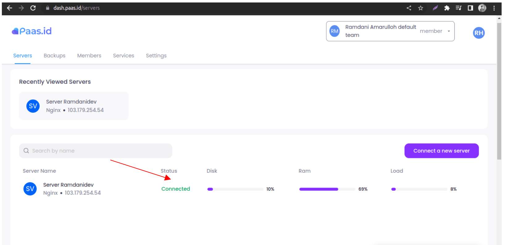 17. Jika proses building sudah selesai makan statusnya akan berubah menjadi Connected, silakan Anda klik pada nama server Anda.