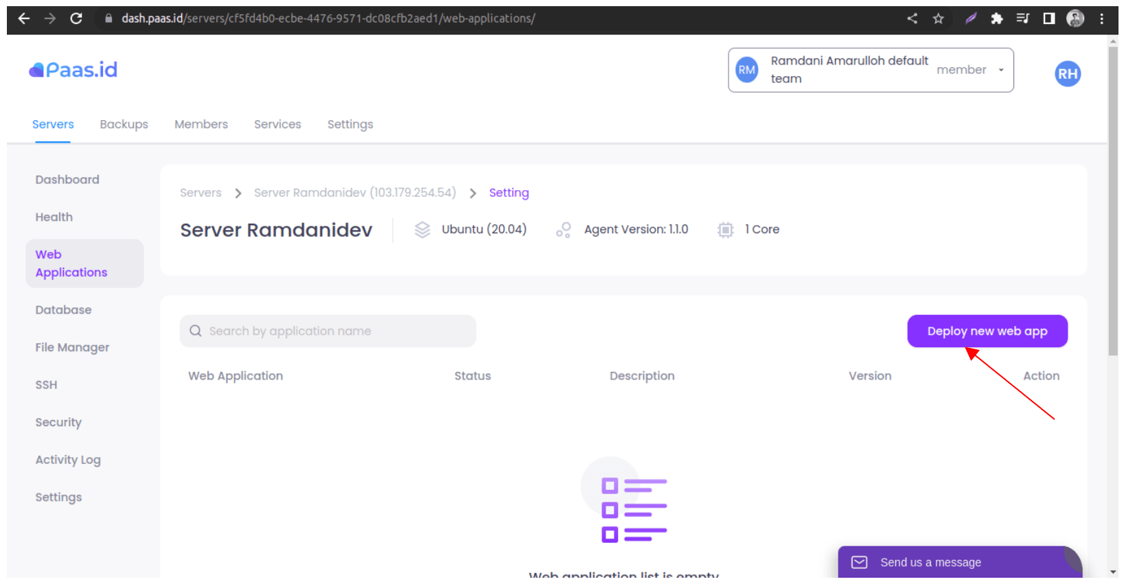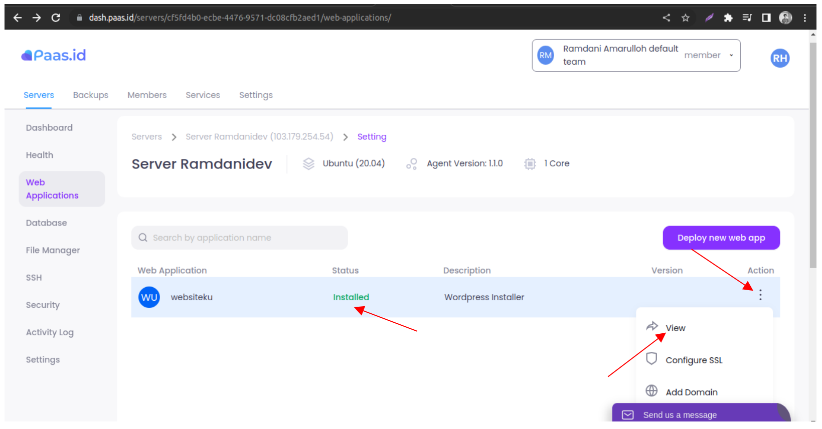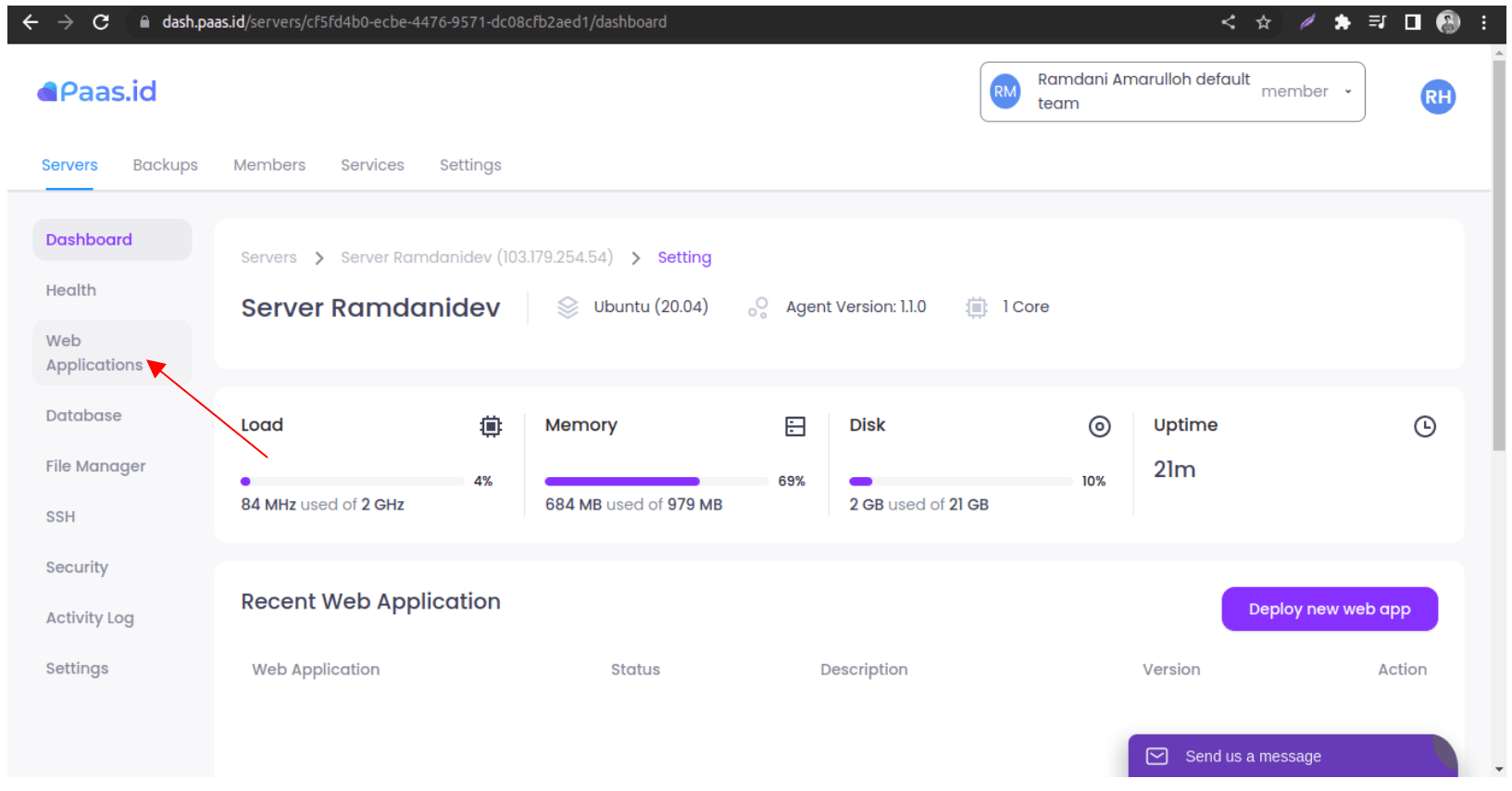 18. Setelah Anda klik maka akan muncul halaman detail dashboard pada VM Anda. Sampai tahap ini menghubungkan VM ke Control Panel VPS Paas.id sudah selesai. Untuk test install aplikasi atau web, dalam tutorial ini kami akan mencoba untuk melakukan instalasi WordPress. Silakan Anda klik menu Web Applications.