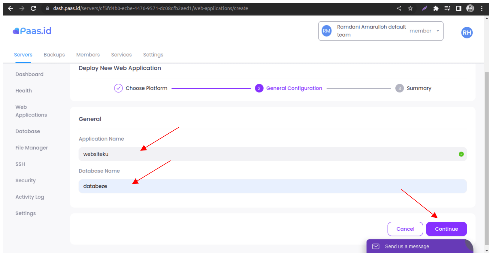 21. Lalu anda isi bagian Application Name dan Database Name sesuai yang anda inginkan, setelah itu klik Continue.