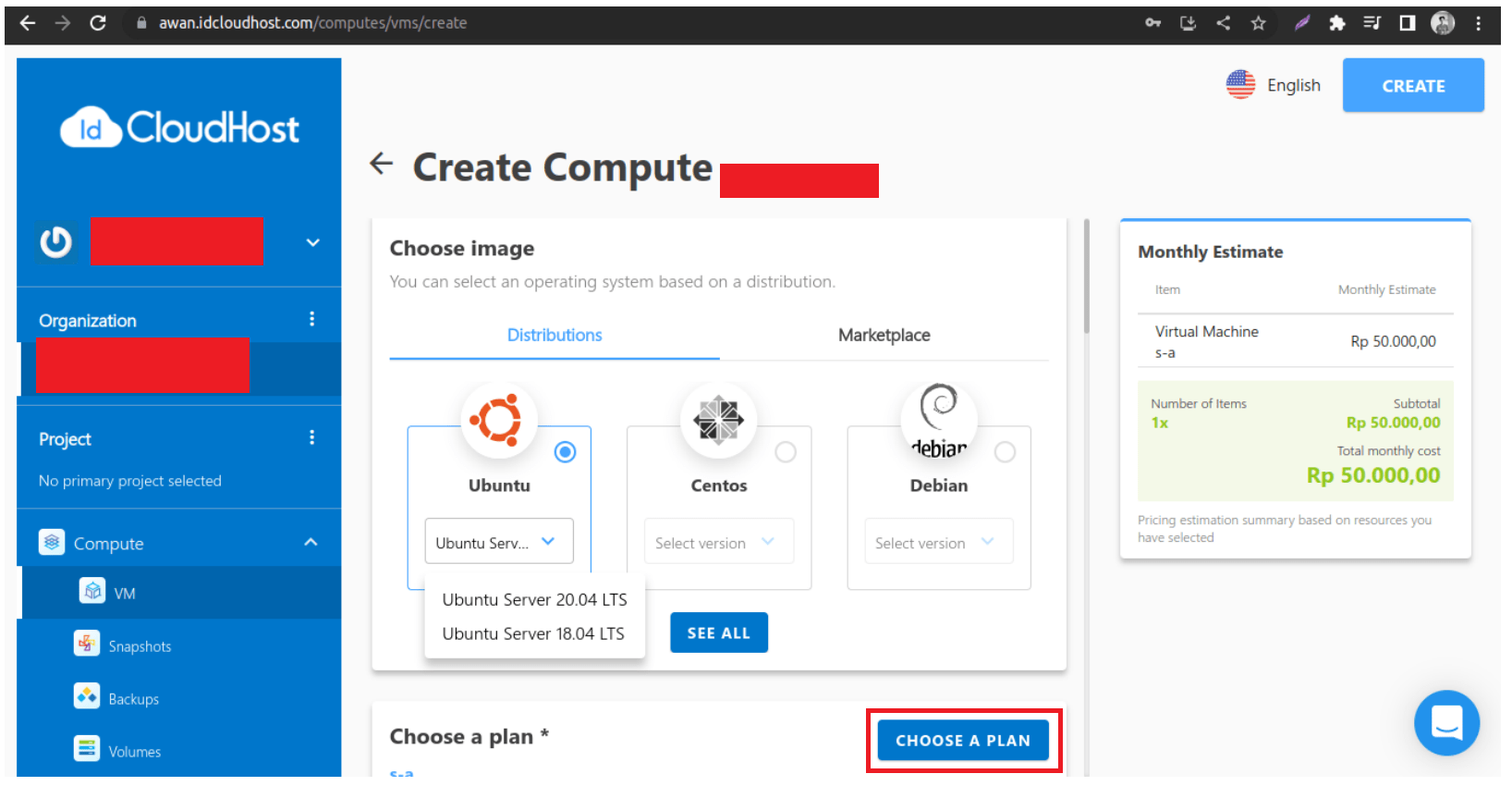 4. Pada bagian Choose image silakan pilih OS sesuai kebutuhan anda, disini sebagai contoh kami pilih OS Ubuntu versi 20.04 LTS dan pilih Choose a Plan atau paket VM yang anda butuhkan.