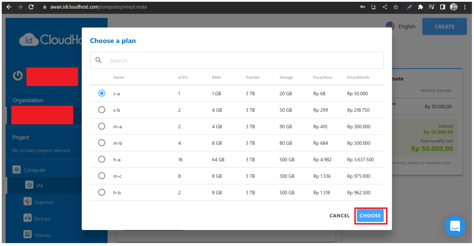 5. Pilih Choose a Plan atau paket VM yang Anda butuhkan.