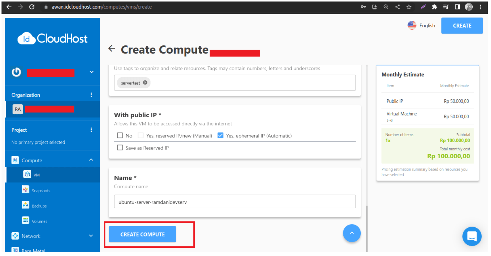 7. Scroll ke bawah dan isi bagian tags jika dibutuhkan. Setelah itu pada With Public IP pilih Yes, ephemeral IP (Automatic) dan pada Compute name isi nama VM sesuaikan dengan kebutuhan Anda, setelah itu Create Compute.