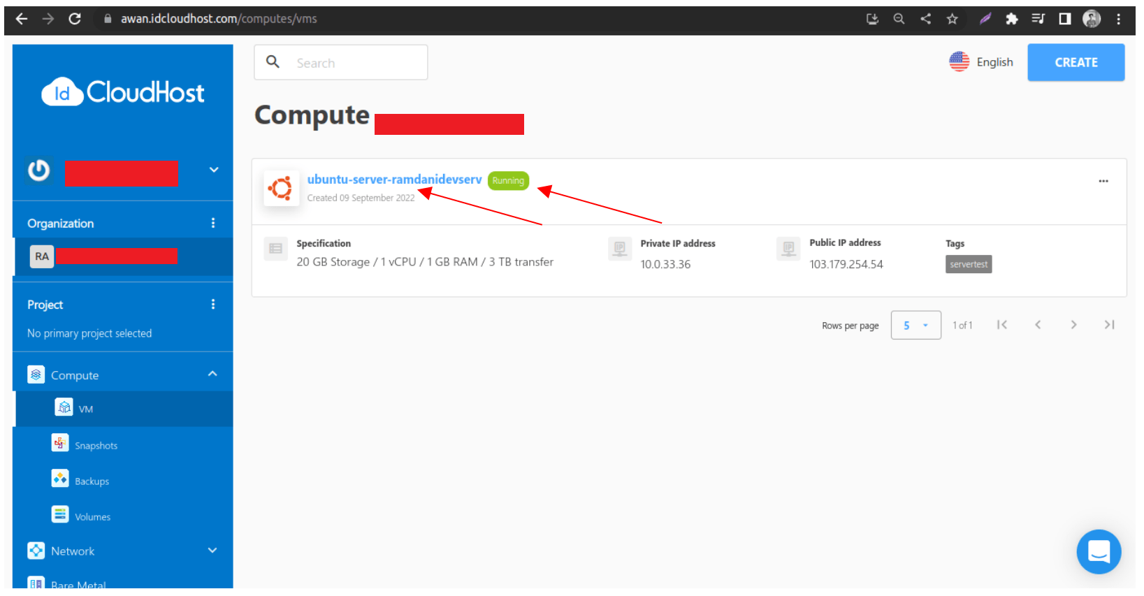 9. Setelah status VM menjadi Running, VM yang Anda buat sudah berhasil dan berjalan. Silakan Anda klik pada nama VM tersebut.